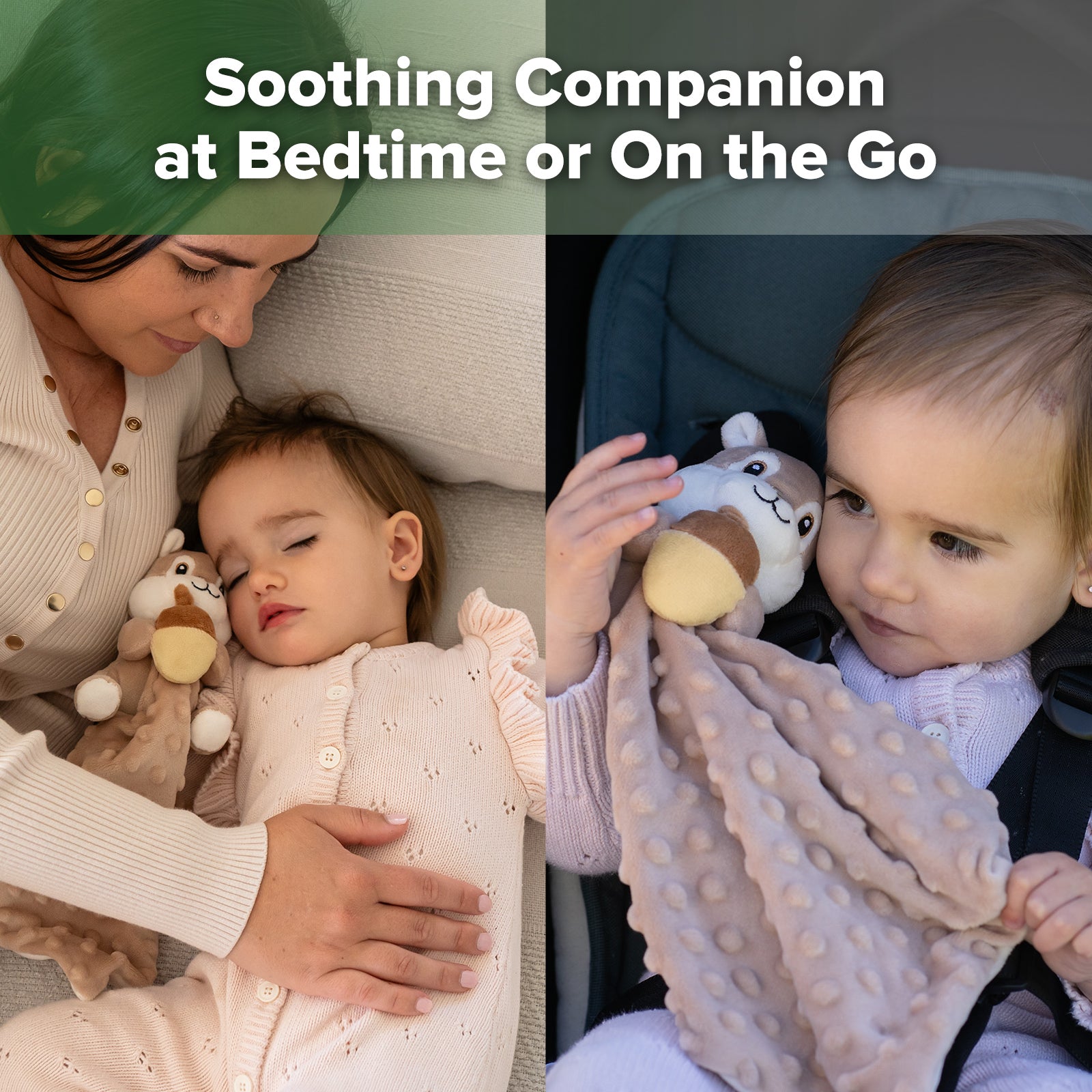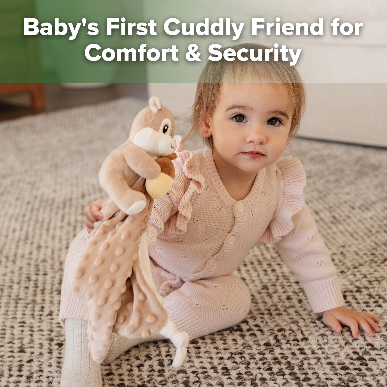 The adorable stuffed animals inspire imagination while calming little ones during moments of fussiness or transition. The Fox and Fawn options include a soft built-in rattle to capture baby’s attention and enhance sensory engagement.