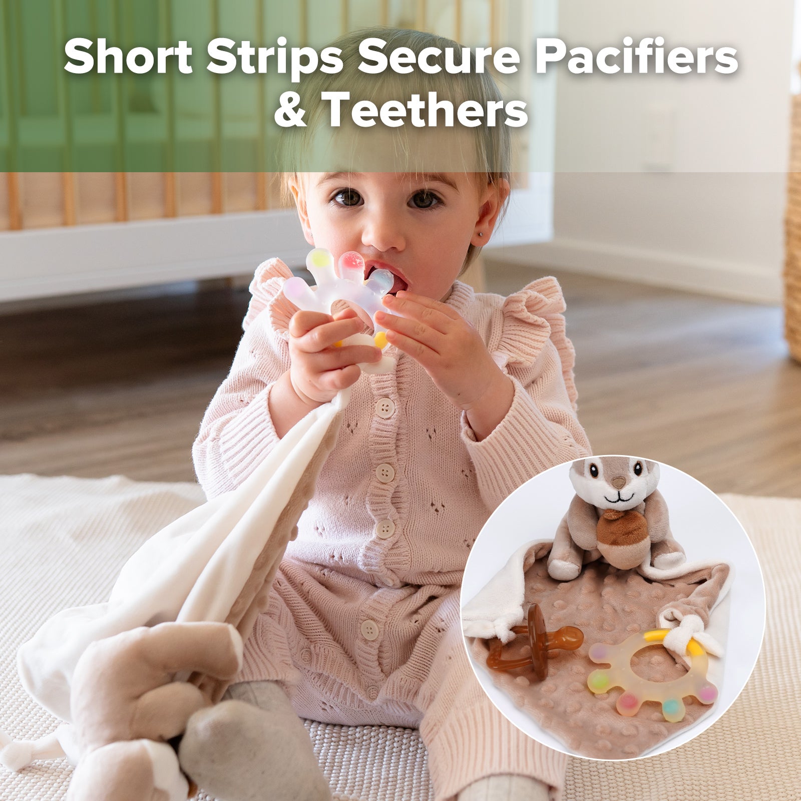 Safe, short fabric ties allow secure attachment of pacifiers or teethers