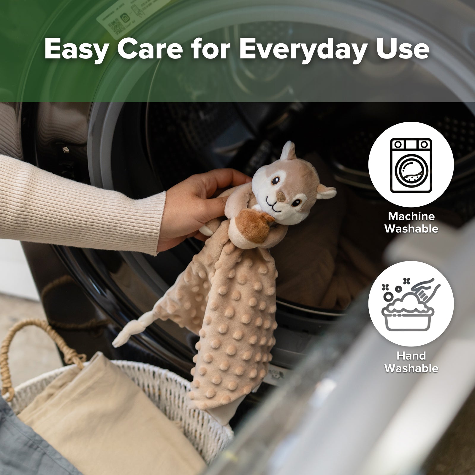Safe, short fabric ties allow you to secure pacifiers or teethers (sold separately) for added relief, while the compact size supports the development of grasping skills and helps self-soothing from newborns through toddlerhood. Durable, machine washable, and ideal for wiping away drool, this blanky stays soft and snuggly wash after wash.