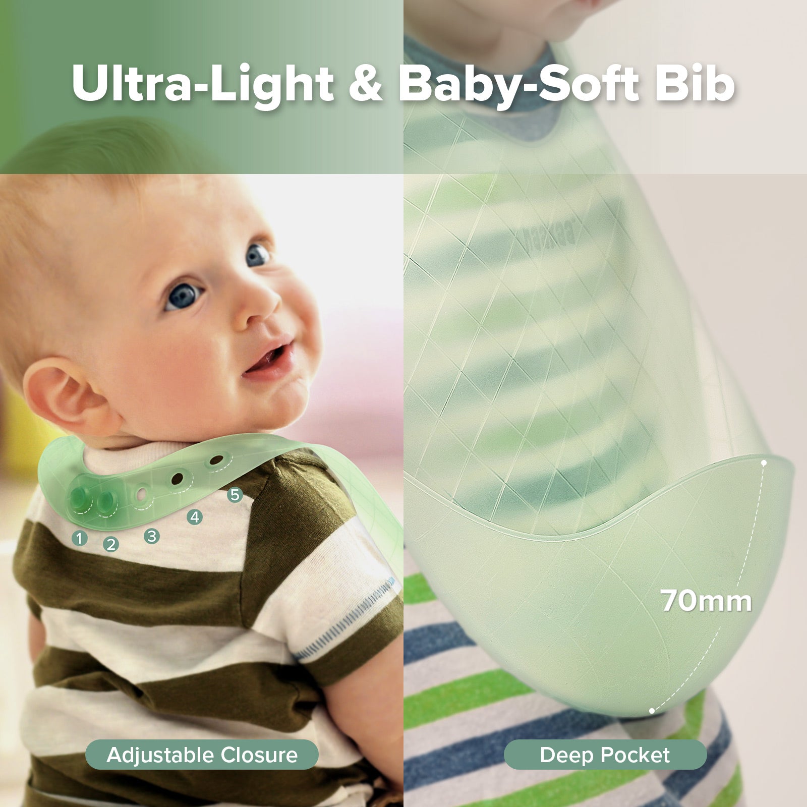 Put the silicone bib around your baby’s neck. Adjust and secure the fastenings for a comfortable fit.