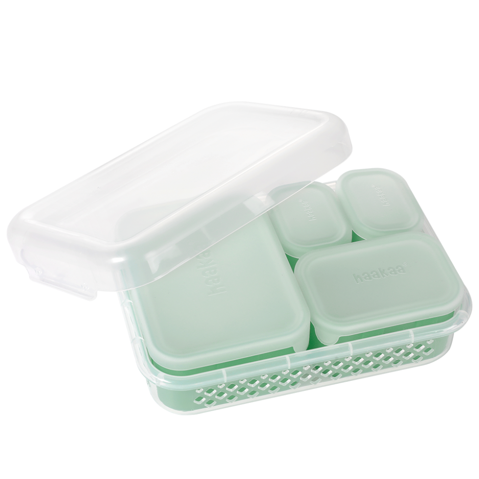 Made from 100% food-grade silicone, the container lids stay secure, keeping food fresh and preventing spills. Measurement markers on the side mean amounts can be checked easily, while the label slots allow for quick identification of contents and storage dates.