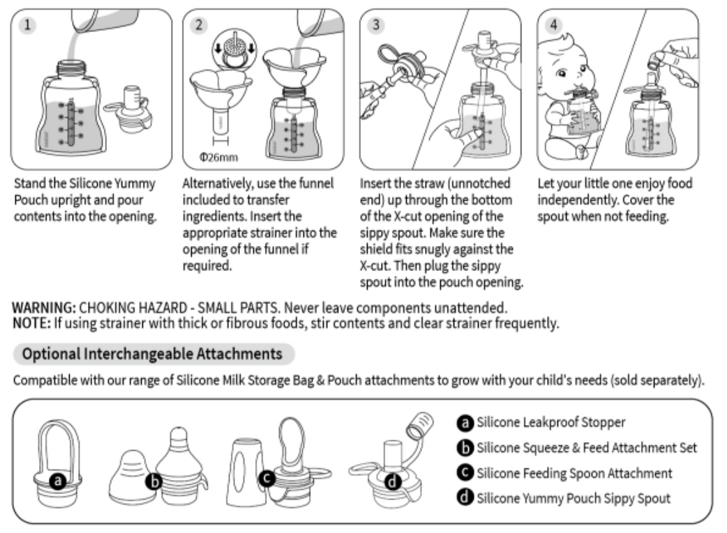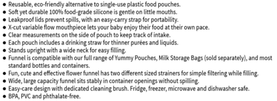 Enjoy snacks at home or out and about thanks to the Fill & Go Yummy Pouch & Flower Funnel Combo! Including two pouches plus our handy-dandy Silicone Flower Funnel and two detachable strainers to help filter those lumpier meals this combo makes it a breeze to get ready and head out the door. Each pouch comes with a sippy spout and straw letting your little one feed themselves at their own pace, building up those all-important independent self-feeding skills. The dedicated cleaning brush keeps the funnel stem clean and hygienic, while the pouch has a wide opening to let you quickly rinse and scrub it after use.