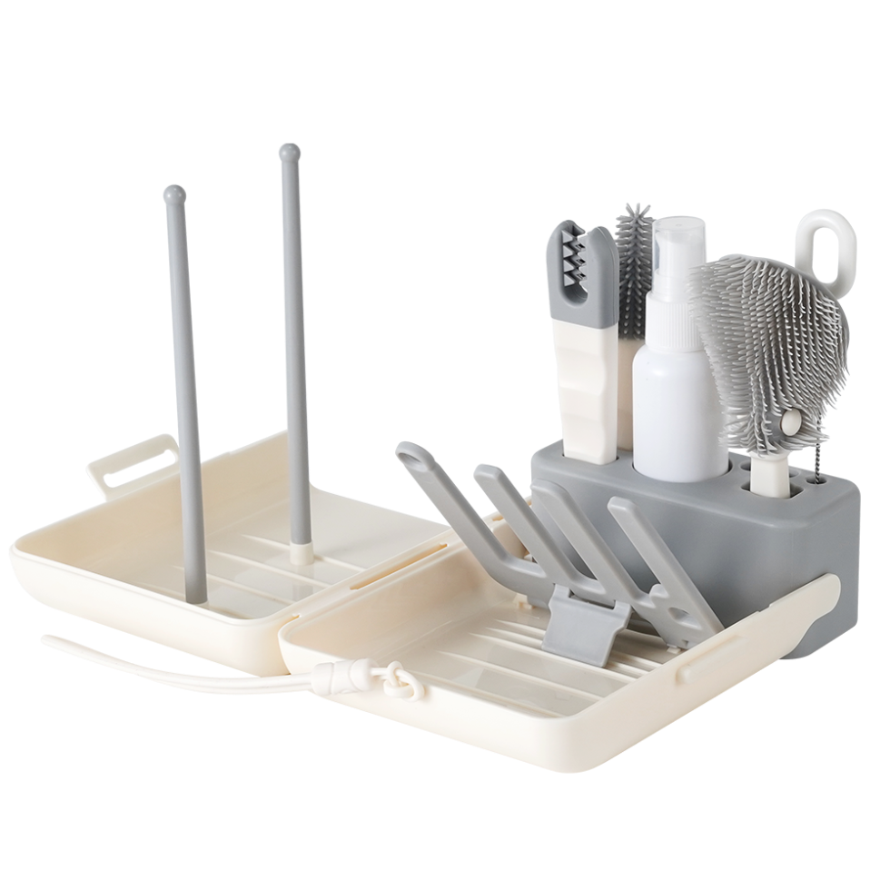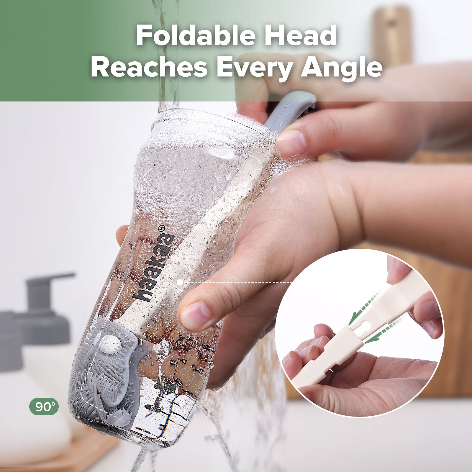 Keep every essential spotless wherever you go with Haakaa's Clean & Dry Travel Brush Set! This all-in-one travel cleaning set is designed to handle daily cleaning tasks, including everything from baby bottles and teats to straws and milk collectors with precision and ease. The bendable bottle brush head flexes for targeted cleaning and features an angled edge to tackle stubborn residue. A 360° brush head with a tapered tip adapts to a variety of sizes, and a simple clip transforms it into a long-handled brush for convenient extended reach. For finer tasks, the nylon straw brush reaches into narrow spots and tight corners, and the dual-direction U-shaped brush fits snugly to the rims of cups or bottles without scratching. Two types of adjustable drying rack allow for effective, efficient air-drying after cleaning. There's even a refillable spray bottle to dispense your chosen cleaning liquids. When you're done, everything folds neatly into the compact, travel-ready case complete with a carry strap for grab-and-go convenience.