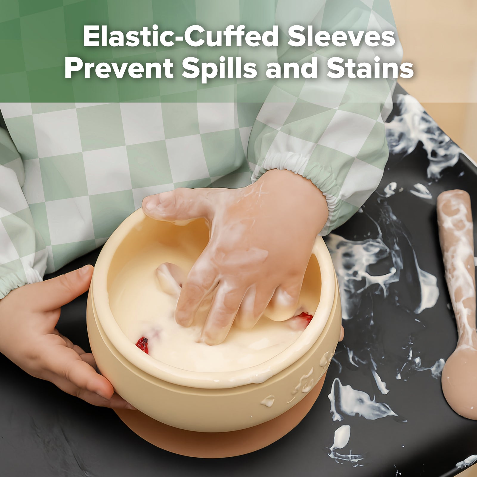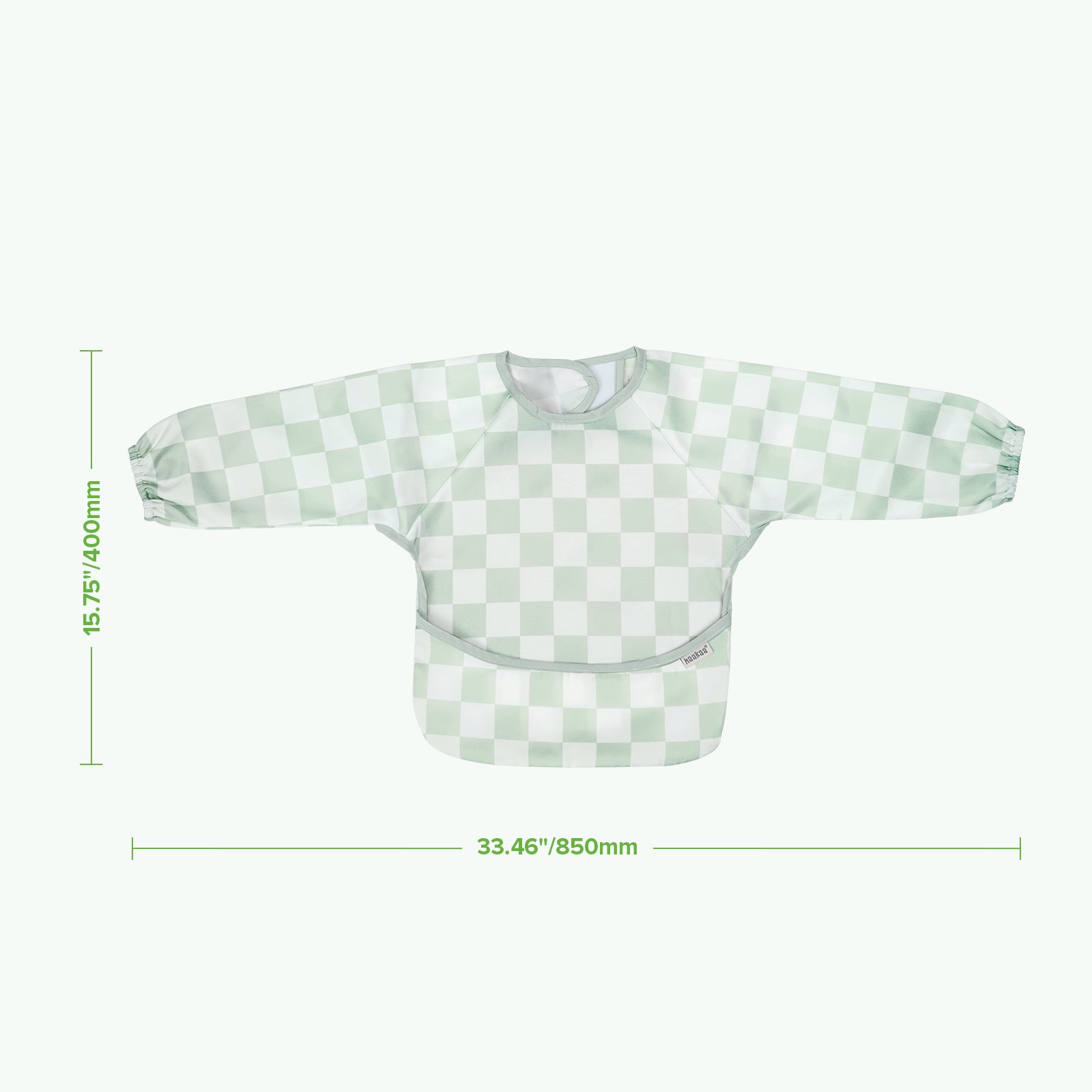 • Long sleeves and generous front coverage help keep clothes clean during meals and play.