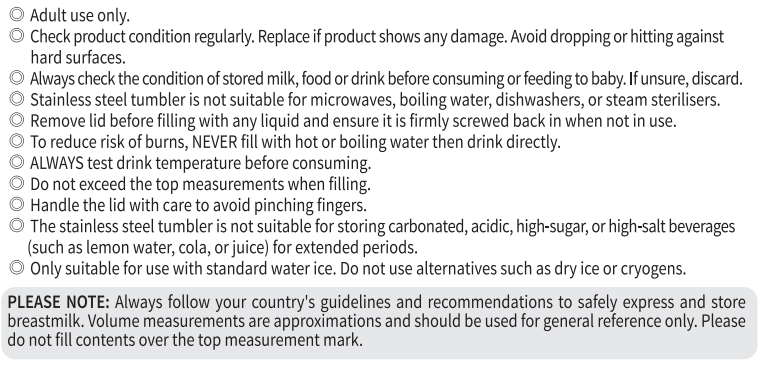 Keep your breastmilk fresh and cool during transport with our Portable Breastmilk Cooler! This stainless steel thermal tumbler features a double-walled flask and a sturdy, removable PP inner storage container to keep your milk extra safe. Simply fill the tumbler with ice and cold water and pop the filled storage container inside – there's no need to pre-freeze! This portable cooler will keep your milk cool for up to 20 hours, depending on starting temperatures and how much ice you've added. The tumbler isn't just for breastmilk, though. Use it to transport work lunches or fill with your own drinks. The huge 900ml capacity tumbler also comes with a straw and lid with two mouthpieces, perfect for however you prefer to use it! The wide openings make the tumbler and container extremely easy to fill and clean. The inner storage container is safe in dishwashers and can be sterilised in boiling water.