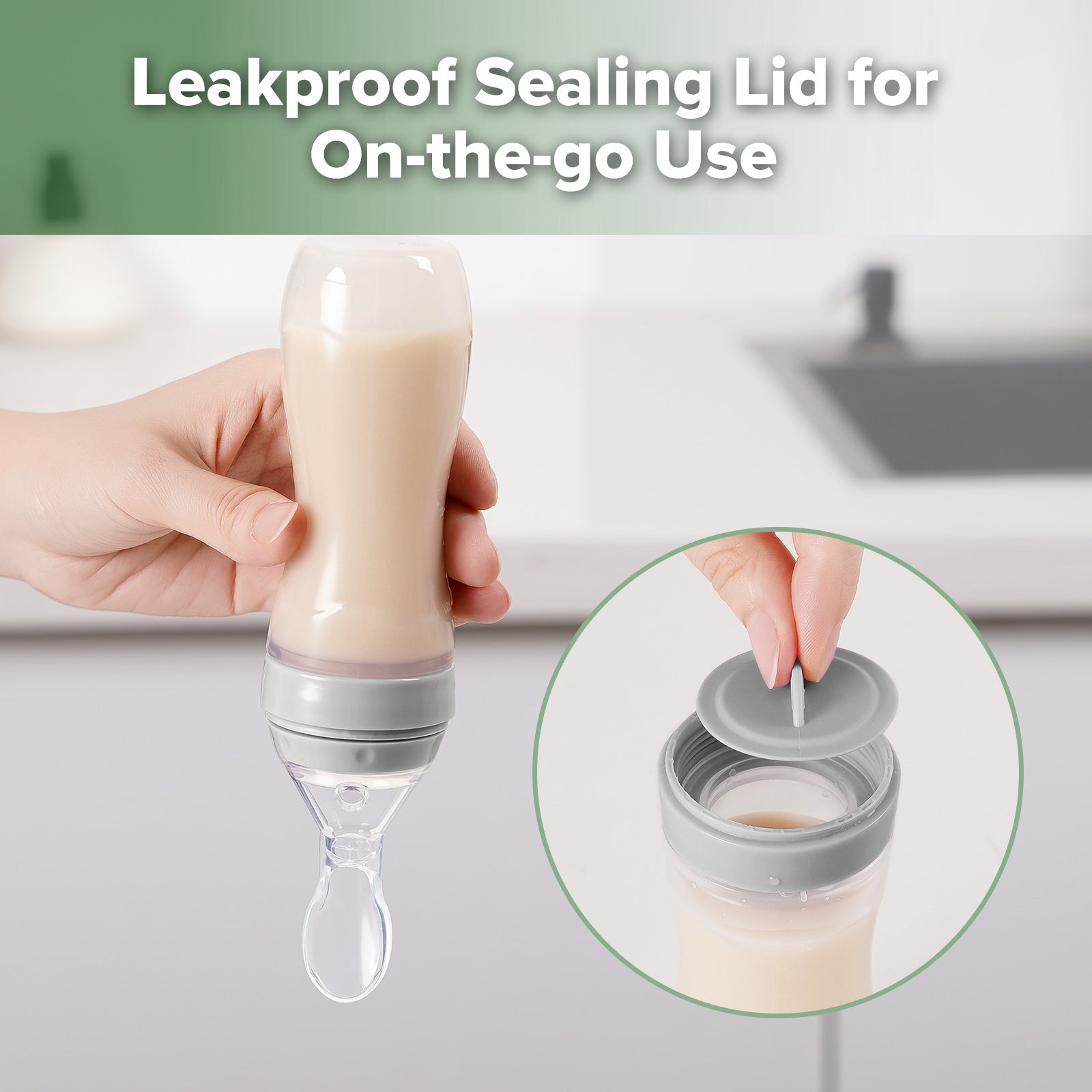 Simply fill the tube with baby food and pop on the lid. The food will remain inside the leakproof silicone tube until it's time for a snack. Remove the lid and gently squeeze the tube to dispense food onto the spoon. Once you've finished feeding your little one, put the lid back on and place it back in your bag!